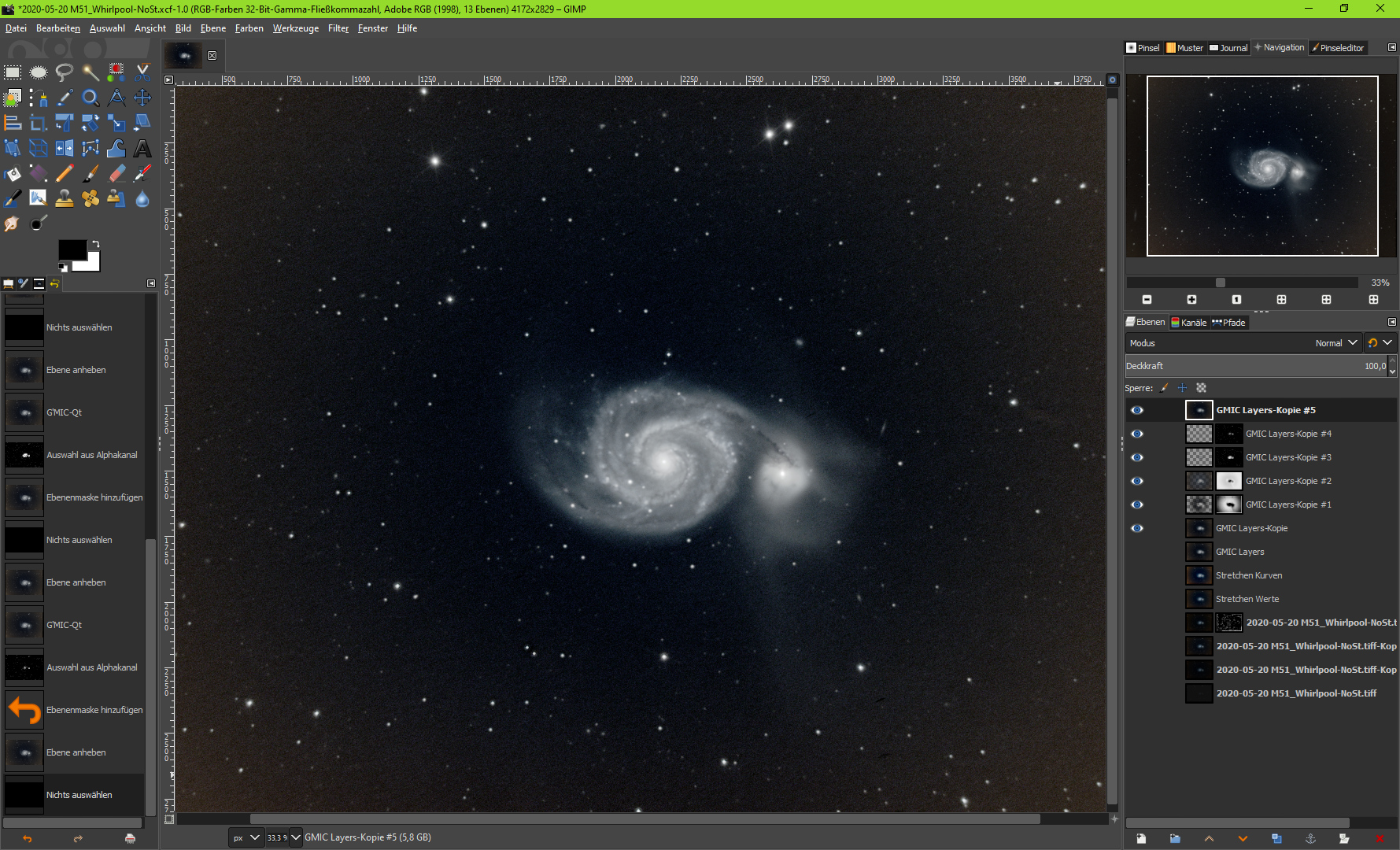 Die Standard Bildbearbeitungsprogramme GIMP und Lightroom sind den meisten Fotografen bekannt. Auch in der Amateurastronomie werden sie verwendet um den Bildern den lezten Schliff zu geben.Lightroom wird meist als Bildverwaltungssoftware verwendet, zum katalogisieren und um globalere Änderungen am Bild vorzunehmen (Kontrast Farbe, etc.).GIMP ist geeignet um in Ebenentechnik zu arbeiten (überlagern) und spezielle Bilddetails mit einer vielzahl an Plugins hervorzuheben.